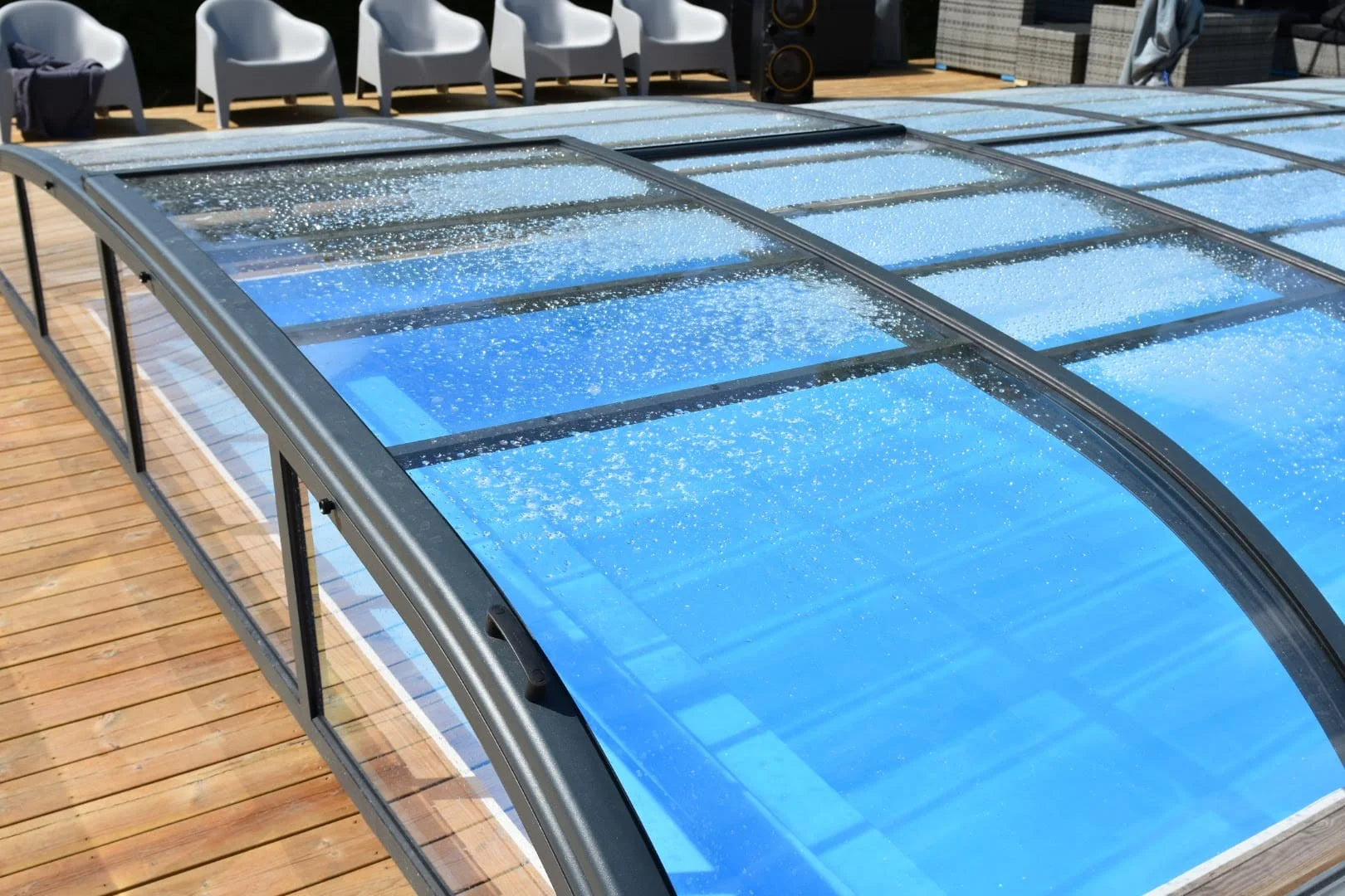 Pooltaket har kraftiga aluminiumprofiler som håller barn och djur borta från poolområdet. Pooltaket är en låg modell som är utrustat med okrossbar solid polykarbonat (klar plast) och antracit/eloxerad aluminiumprofil.